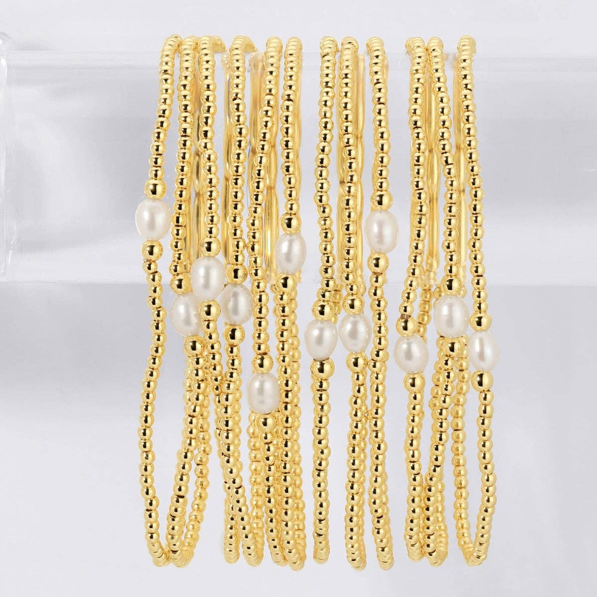 Shimmery, iridescent + playful. The Details: 6mm white, organic freshwater pearls cluster set gold detachable cord and button detail stretchy to fit 7 1/2"