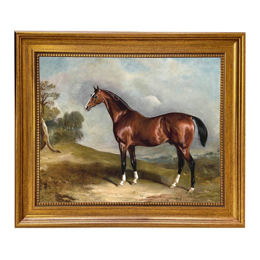 Vintage horse bookplate C matted in green and brown tartan under glass in a wooden frame