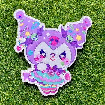 A plushie / stuffed animal of a bunny all tied up with string. This vinyl sticker is waterpoof. Roughly 2.7" x 3"