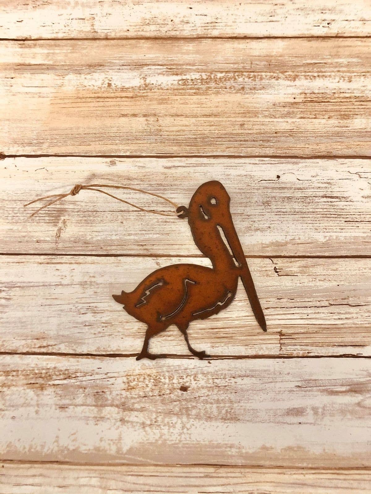Pelican ornament. 4.5 H x 4 W This Ornament is made with 18 Gauge Steel. Do to the Natural Rusting Process color may vary slightly, Made In Prescott Arizona