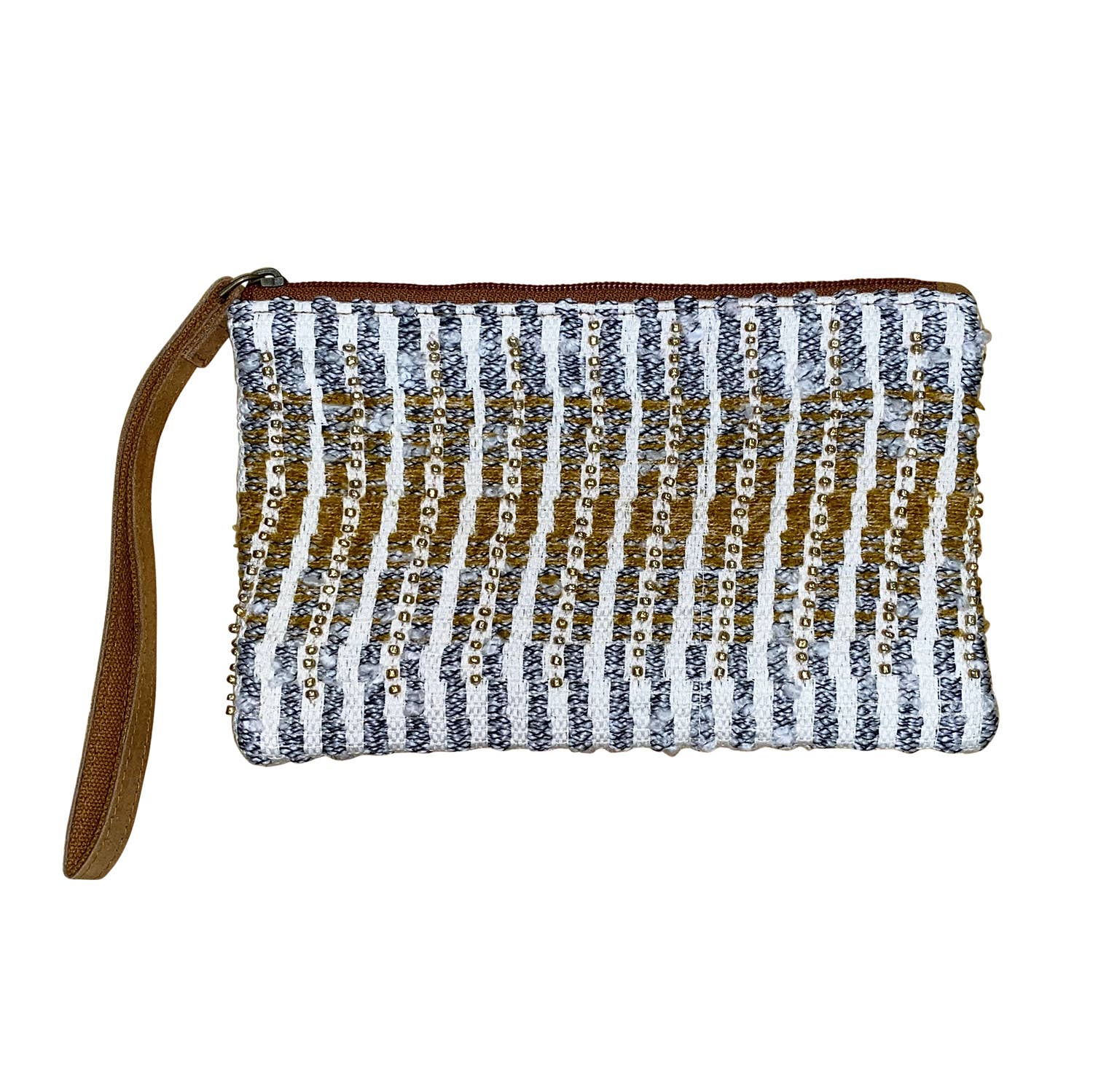 Inspired by weathered driftwood and smooth stones on a remote beach, we created this mellow take on classic Breton stripes. A shimmering band of gold, in metallic leather, adds the perfect sunny touch. Sails that have been reclaimed after seasons at sea have earned unique marks and colorations that enhance the charm of this handcrafted bag. Use it in on its own or keep essentials like cards and keys handy inside a larger tote.