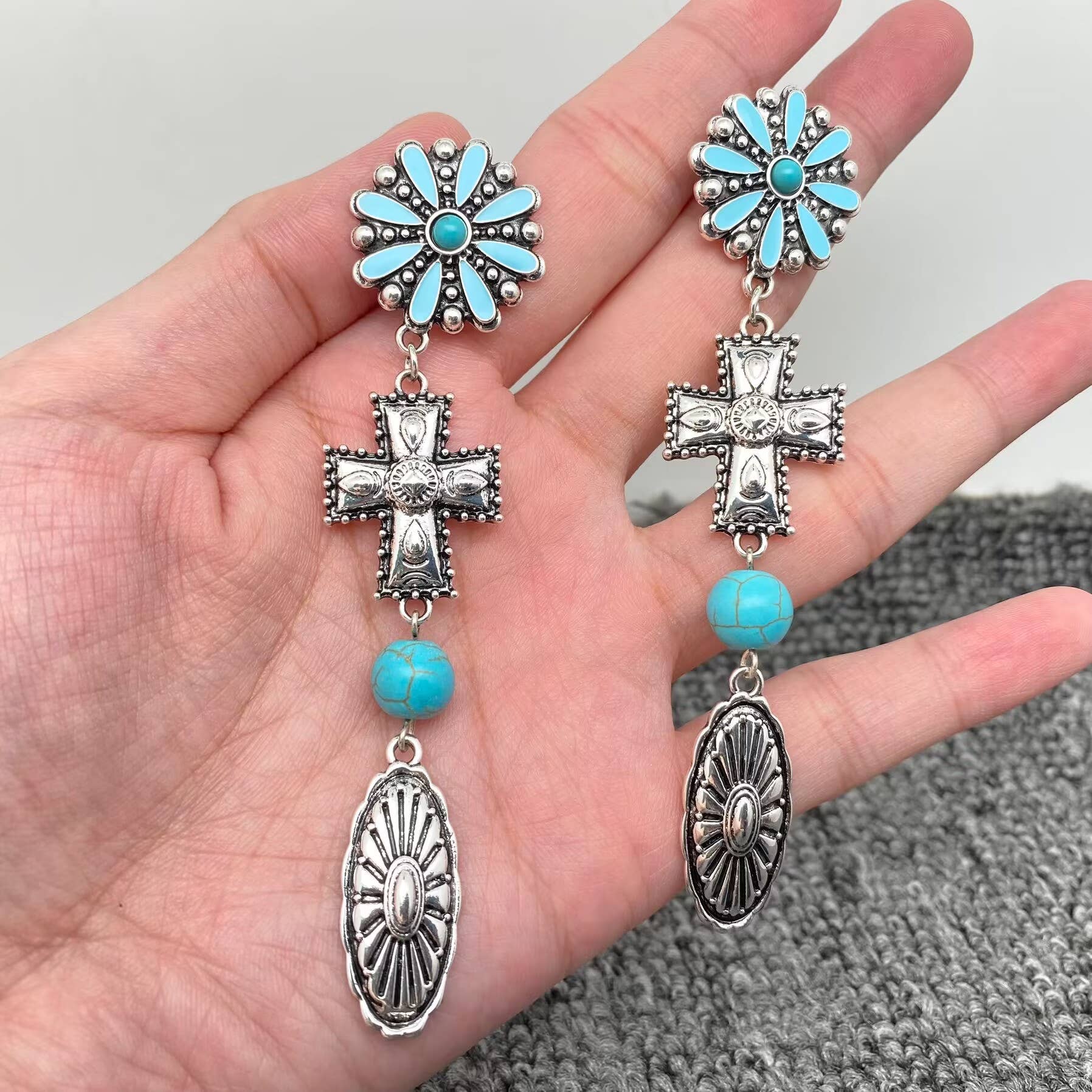 "Dangle these stunning earrings for an effortlessly boho-chic look. The turquoise cross adds a touch of whimsy to any outfit. Perfect for those who love to accessorize with a little bit of fun and flair!"