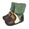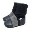 Nooks Design felted wool booties are made from 100% pure New Zealand lambswool which has been felted for strength and durability, and paired with rugged hide leather soles that provide slip resistance on laminate, hardwood or tiled surfaces. The adjustable flap closure makes them easy to put on and a built-in elastic in the ankle cuff holds them gently in place. Our booties are ideal indoor shoes and are also durable enough to be used outdoors in dry conditions.
