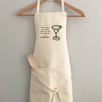 "I keep trying to make protein shakes, but they keep coming out as margaritas." 100% cotton apron with 2 front pockets and adjustable neck strap and waist tie.