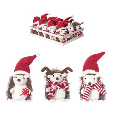 Bring whimsy to winter displays with this set of 12 assorted christmas mice, dressed in festive scarves and cozy knit hats. Made of soft polyester, each mouse stands 6" tall—perfect for shelf styling, stocking stuffers, or tiered trays. With a mix of red, green, and classic holiday patterns, these little characters instantly add charm to seasonal merchandising. Retailers can sell individually or as a bundled display. Ships in a small wooden crate for easy in-store setup. PK/12 assorted. Polyester, Mdf 6" H x 4" W x 2.5 " D. Pkg Desc: PK/12 AST