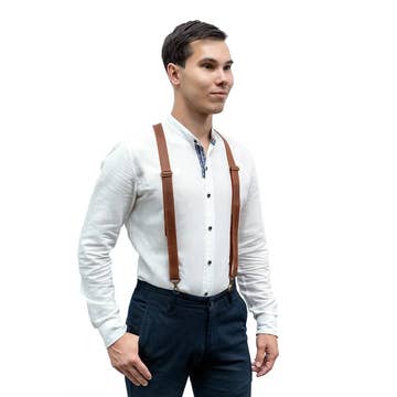 Handmade suspenders made from chestnut leather to pair with your favorite high-waisted pants or skirts. Your choice of silver or brass hardware. Adjustable using the buckles in front. Attaches to pants with either swivel trigger clips (requires belt loops) or suspender clips. This Y-back style has two clips in the front, and one clip in the back. Available is four lengths. (Measure from top of back belt loop over shoulder to top of one of your front belt loops) S length: 32 - 35" M length: 36 - 39" L length: 40 - 43" XL length: 44 - 47" If a custom length is needed, feel free to contact me with the request!
