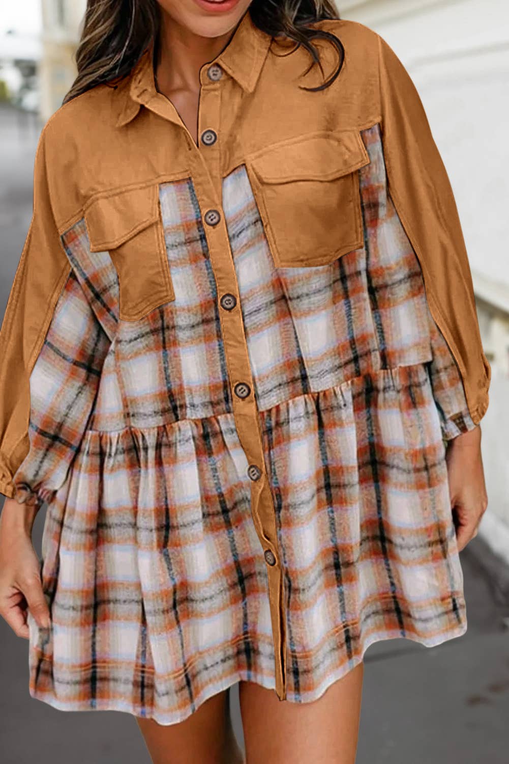Washed Plaid Shirt Dress Button tab sleeves Fringed hem Hi-lo hem Button down Chest pockets -Model wears: S / Model height: 5` 8"