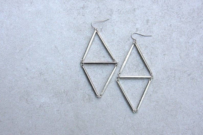 Prisms and geometric designs are in this season, and these large, dangling earrings are simple but big in statement. They look especially good with long hair and are comfortable for all day wear. Earrings are 3" x 1.5".