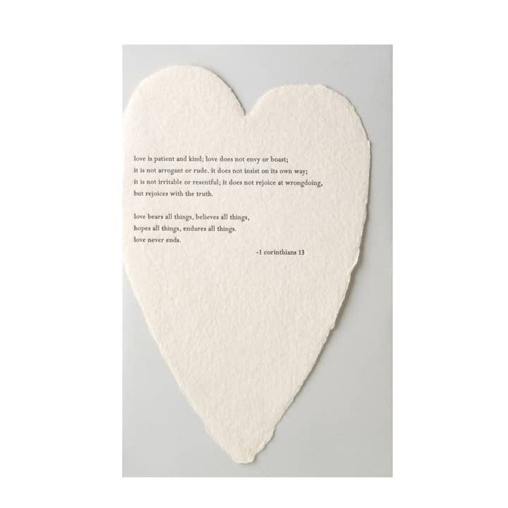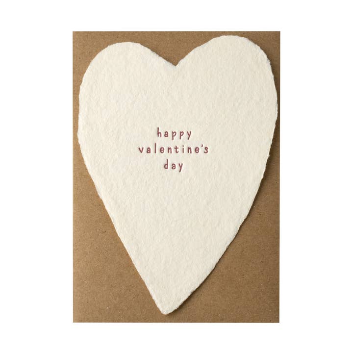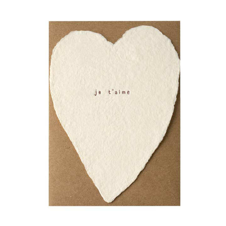 these popular flat handmade paper hearts with hand-lettered greetings are easy to give… they simply make everyone happy! i ♡ you - soy ink letterpress on cream handmade recycled cotton paper heart - 3.5 x 5 inch full-deckled flat note - single cards packaged with a kraft envelope and in a clear sleeve - boxes packaged with 6 kraft envelopes and in a clear box
