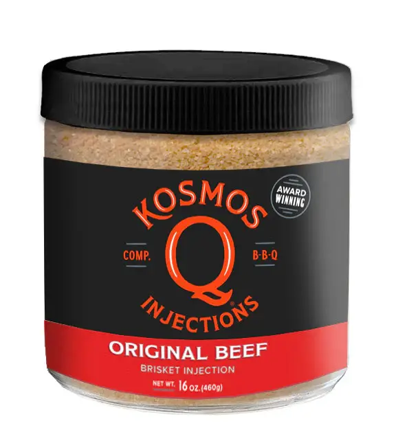 Nothing says "Heaven on earth" quite like tender pork ribs and loins, and nothing makes them tender like a premium injection. Using a special home blend of all-natural salts and spices primed for maximum moisture retention, combined with the smoky sweetness of brown sugar and top-quality pork stock, brace yourself for a pulled pork injection that gives a whole new meaning to the phrase "fall-off-the-bone." Perfected by a competition pit-master, FOR competition pit-masters, there aren't many other clear-cut ways to secure your throne as Ruler of the Grill. You know your ribs are headed in the right direction when you choose to use Kosmos Q Pork Injection!
