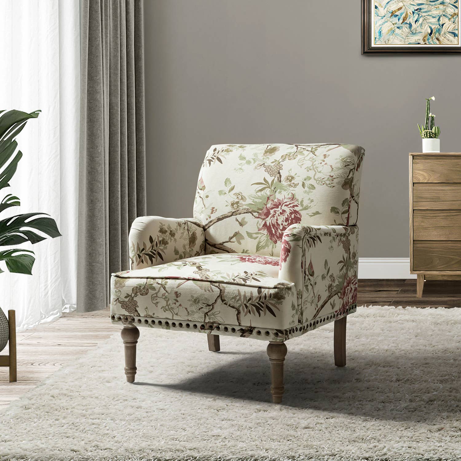 Made with a sturdy solid wood frame in a reclaimed grey finish, this accent chair features a slatted back design and open frame arms for a charming transitional look. The removable back cushion and the seat are upholstered in a rich ivory fabric and use plush foam filling to provide exceptional comfort. With a firm seat, this accent armchair offers a simple and clean update to any room in your home. Assembly is required. 1 Arm Chair:28"W x 30.25"D x 34"H Seat Dimension:24"W x 20.5"D x 18"H Seat Cushion Thickness:18" Arm Size:24"W x 25"H Leg Height:10.5" Back Rest Size:22"W x 16"H Maximum Weight Capacity:300LBS Frame Composition: Solid wood and plywood Leg/Arm Material: Solid wood Seat and Back Material: Upholstered Fabric Composition: 100% polyester plain weave Cushion or Upholstery Fill Material: Foam Wood Finish: Reclaimed grey smooth