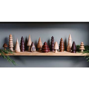 OUR MOST POPULAR & LOVED ITEM Hand-turned trees in small batches on our wood lathe, beautiful minimalist trees in varying heights, sizes and styles can create your very own nature-inspired woodland forest on your mantle, table design, or bookshelf. They also make great functional items for Montessori play. Sealed with food-grade beeswax and linseed oil, they are safe for little mouths. They make the perfect heirloom decor that will last for generations. They are each carved from a variety of responsibly-sourced native hardwoods such as maple, walnut, and cherry. RETAILERS: These trees are made in small batches for our customers and we will do restocks regularly as we sell out within the hour. Sold in gift boxes of 3 or 5, or singles (asst'd). 3 pack has an approximately 3 inch, 4 inch, and 5 inch tree. 5 packs has an approximately (2) 3 inch, (2) 4 inch and 5 inch tree. Singles come individually. *Please note if you do not need the trees in gift boxes for eco-friendly purposes!