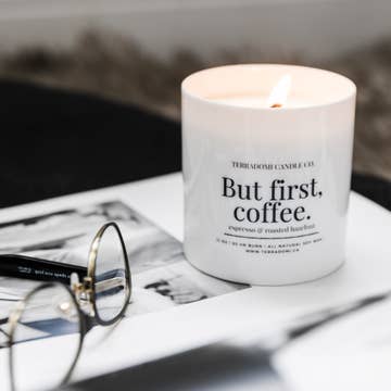 Fresh Roasted Coffee is a delightful, morning aroma of roasted French coffee beans, blended with soft hints of cocoa nibs, warm vanilla, and sugar. Made in Lafayette, Indiana with domestically grown, natural soy wax for a clean, long-lasting, and even burn. We use premium fragrance oils (approved by thousands of candle testers across the U.S.!) and 100% lead-free cotton wicks. All candles are paraffin-free, dye-free, and cruelty-free. This hand-picked fragrance is phthalate and paraben-free. 16 oz Candle: RRP: $ 38.00 APPROXIMATE BURN TIME: 60 hours UPC: 840174202455
