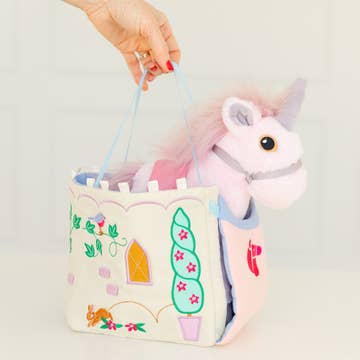 The ultimate accessory for your magical adventures — Piccoli's Castle Bag! Perfect for carrying your unicorn in style, this bag features handles that cleverly transform into the drawbridge sides. Simply close the bridge and the handles become handles again.