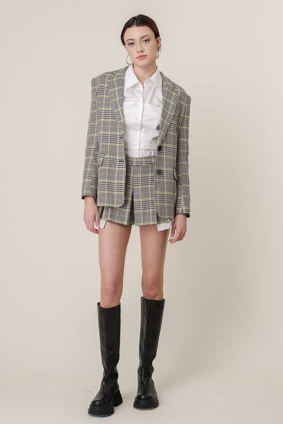 Tweed double-breasted blazer. Model is wearing size: S Model Measurements Height: 5' 7.5" Waist: 24" Bust: 32C" Hips: 36" Top, dresses, bottom, jackets, vests, blusas, vestidos, pantalon, blouse, metalico, metalic, sweater, sueter, bodysuits, shorts, skirts, lentejuela, satin, long sleeve, sacos, blazer, sexy dresses, romper, jumpsuit, knits, skort,midi dresses,corset