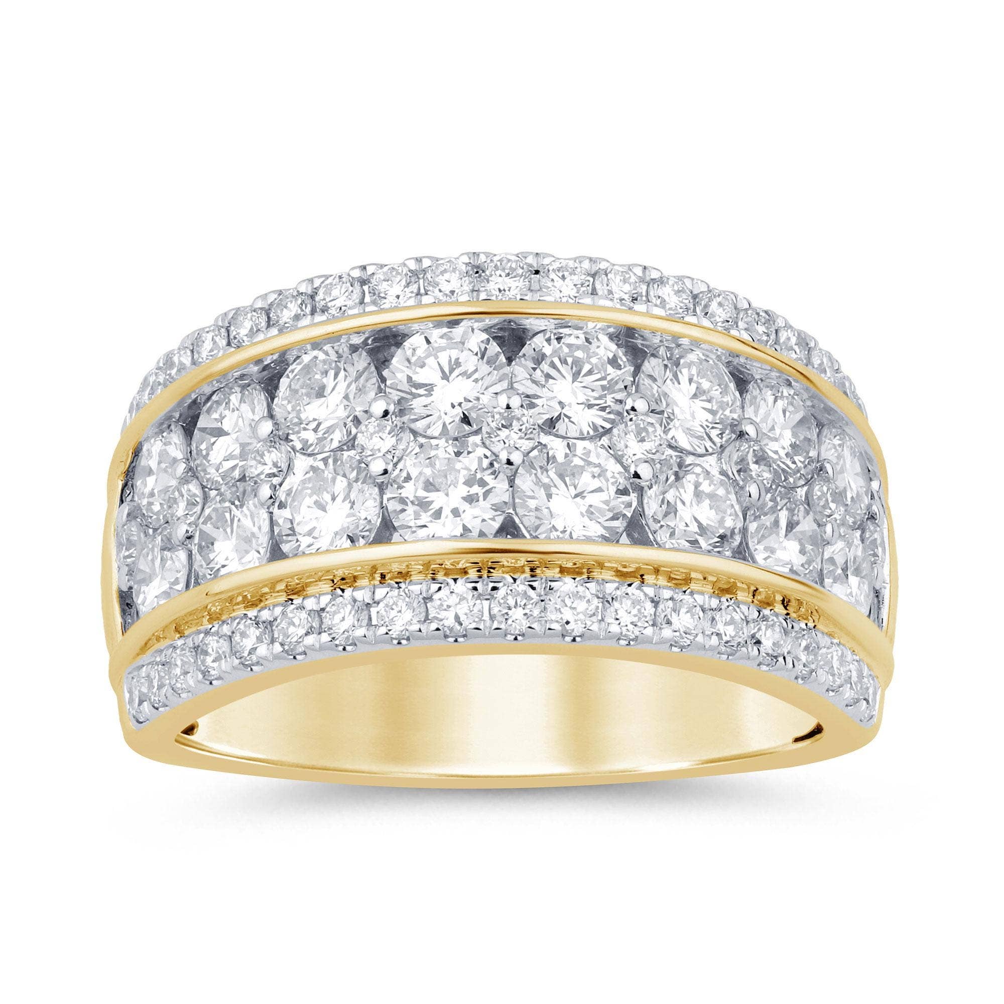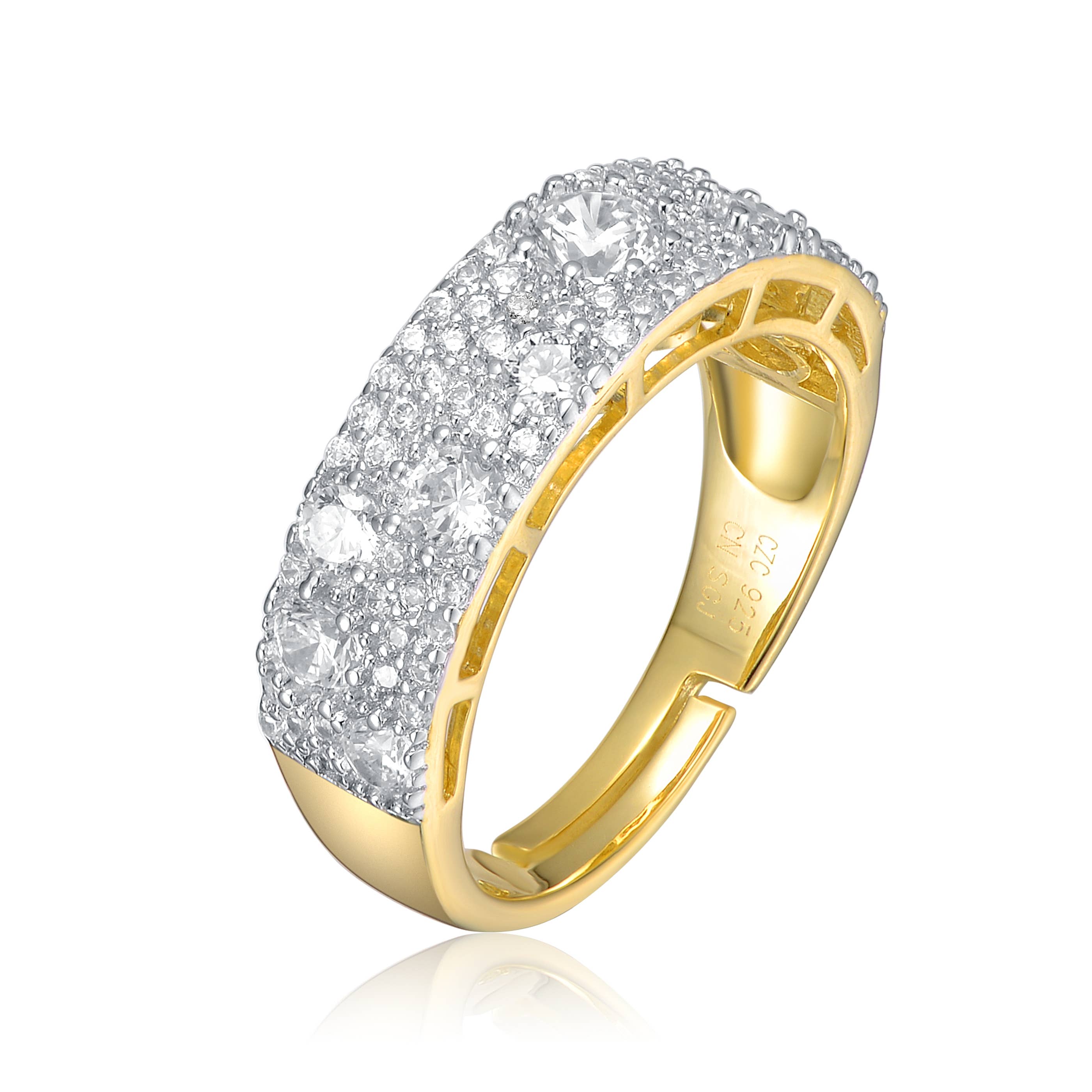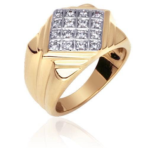 Fashioned with two gold and silver tones and brilliant cubic zirconia this ring was dreamt up with design in mind. Our two-tone and tri-tone process use 18k gold that electroplated coating the item with heavy layers of 18k yellow gold giving it that 14k hamiliton gold polished look. The silver tone is achieved by applying a heavy coating of genuine rhodium to the item giving is a lustrous silver tone high polish.