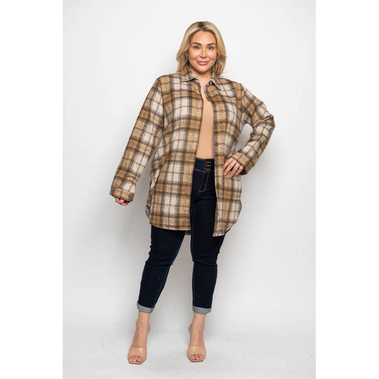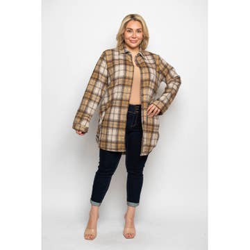 Plaid flannel shacket. Super long over fit. Single layer. Collar and button down flannel jacket with contrast hoodie. with front top 2 pockets and side 2 pockets. Super long fit. Over size. Model is 5'8 wearing size Small. 100% poly. Import. Inside pack comes S/M/L/XL (1:2:2:1) 6pcs/pack.