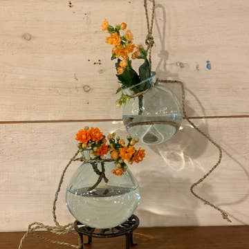Excellent for garden and coastal decor accents - plant hanger, seashell collection and more. Each measures approximately 8" x 8" x 7" Made of glass with rope for hanging. Packaged in a brown box.