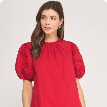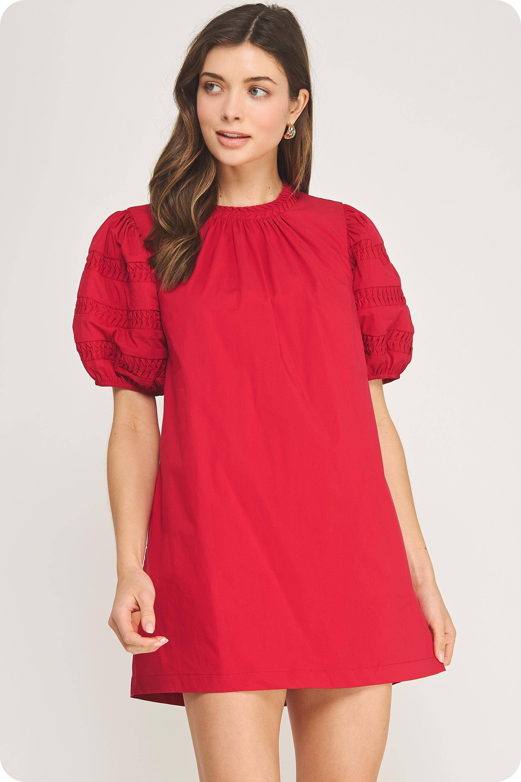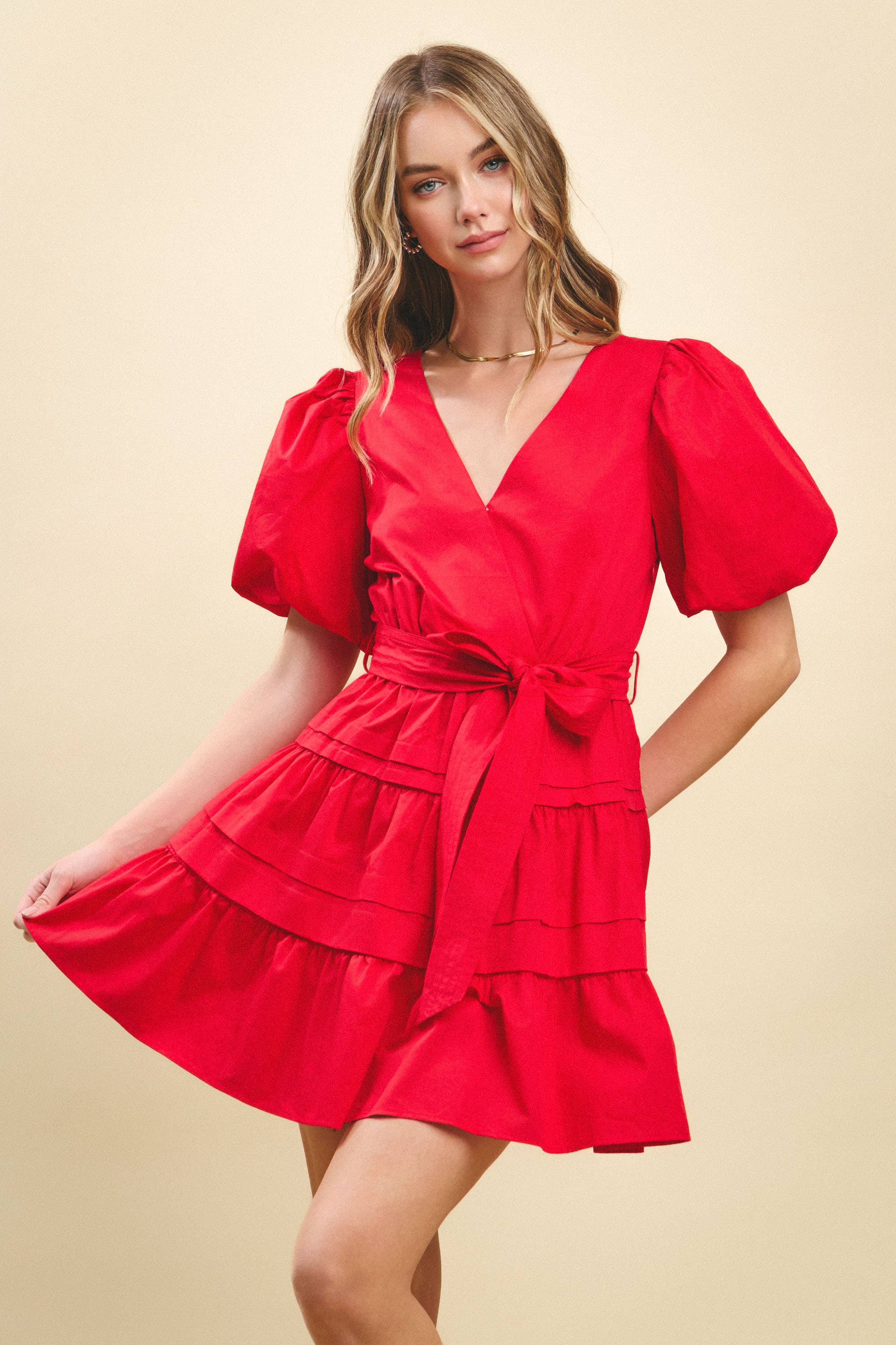 V-Neckline with bow detail dress with scalloped poplin ruffle sleeves. Featuring a tiered skirt with a scalloped hem, a contrast color trim and concealed back zipper. Model Size + Fit: Model height: 5'9" Dress size: Small Bust: 33 Waist: 25 Hips: 34
