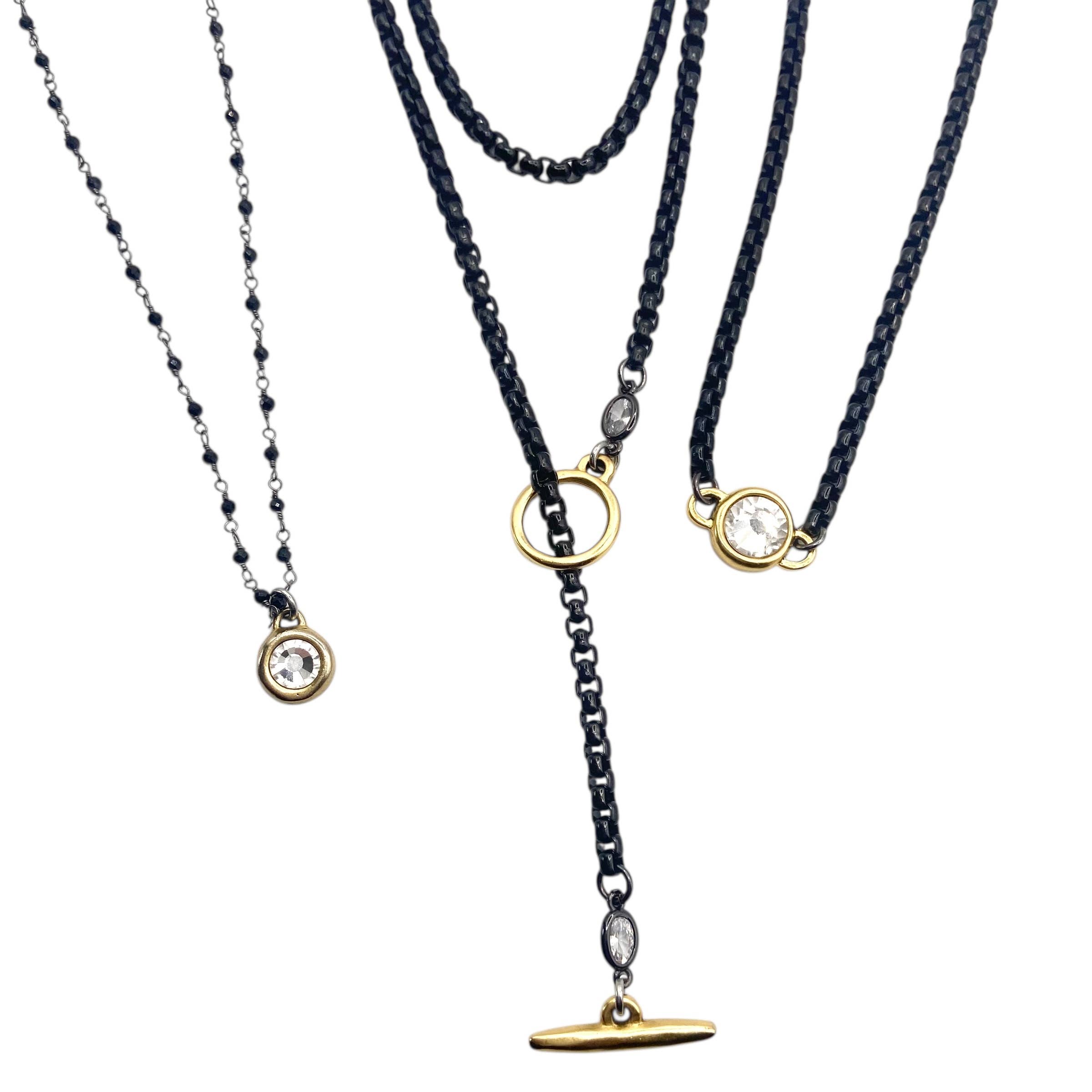 The Jules lariat necklace is a mesmerizing accessory that will have everyone asking where you got it. Featuring a sleek circle shape and captivating glass bubbles that seem to float around the necklace, it's a stunning piece that elevates any outfit. As an extension of our beloved Helio line, the Jules necklace offers the same impeccable craftsmanship and unique, eye-catching flair. Adjust the length to your preference for a personalized look that flatters your style. Materials All metals are brass finished with plating (see below) *Orbs are Tinted Glass (Please note: these glass beads are sturdy and are not easily broken). Finishing 12K Gold, Rhodium, *Black Zinc on brass (*Nickel Free) Dimensions 0.5mm brass chain, plating as noted above Approximately 35 1/2" long. Overall the pendant is 3 1/4" x 2 1/2" and 1/2" at it's thickest point.