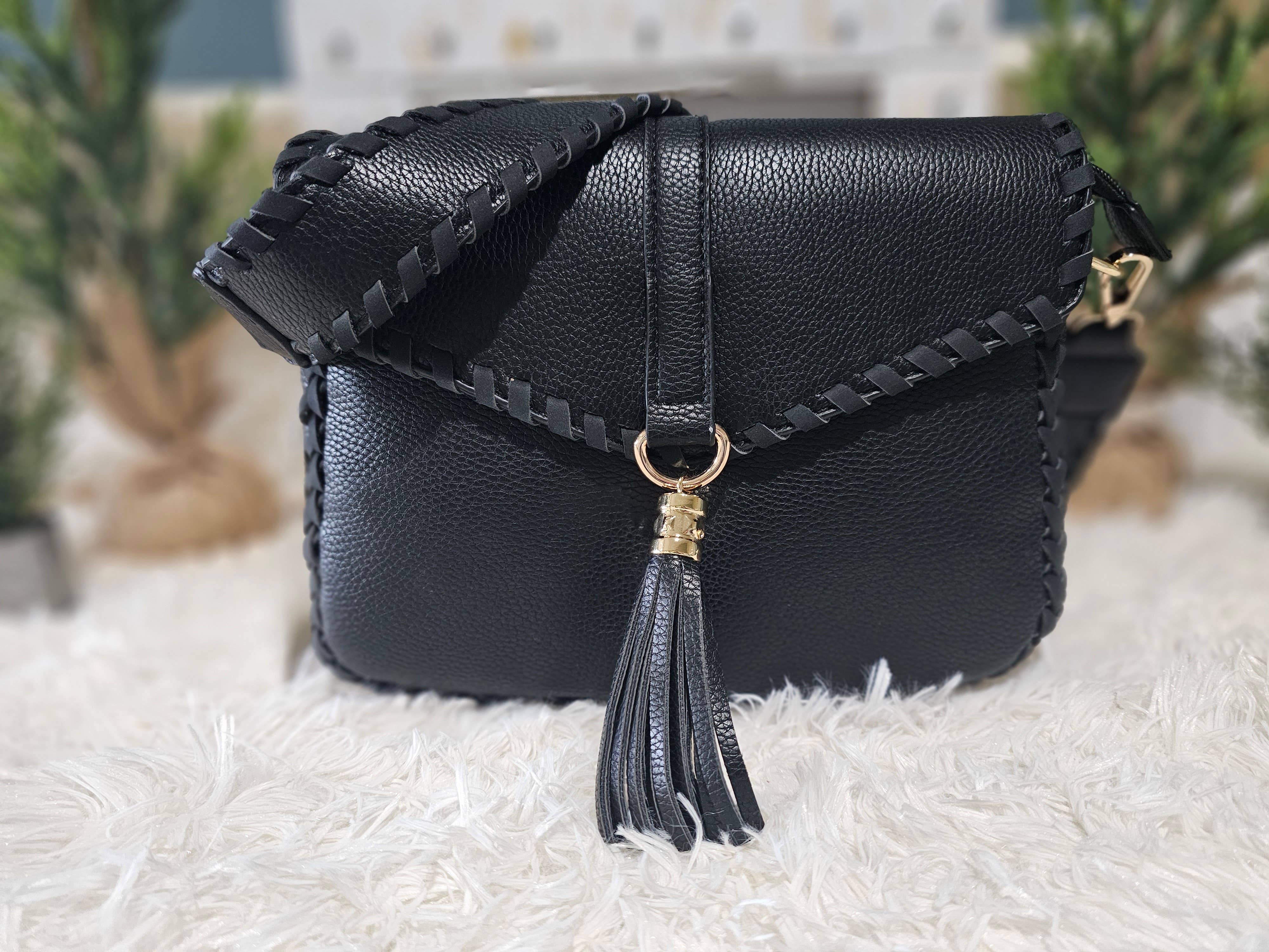 Item Details: -Monogrammable -Style: Top Zipper Closure Studded Crossbody with Foldover Long Tassel -Features: Top zipper closure, studded details, foldover long tassel, adjustable/detachable shoulder strap, inside slip and zip pockets, one back zipper pocket -Material: Vegan leather Dimensions: -Length: 13 inches -Height: 10 inches -Depth: 2.5 inches This monogrammable crossbody bag combines style and functionality seamlessly. Adorned with studded details and a chic foldover long tassel, it's a statement piece for any occasion.