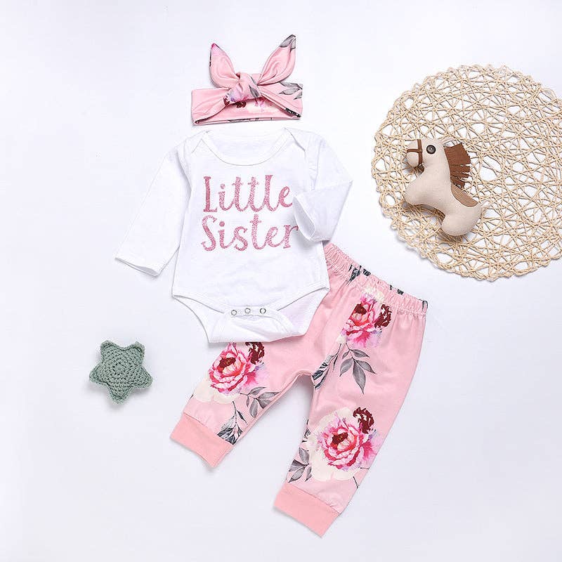 Baby Girl's LITTLE SISTER Print Bodysuit, Floral Pants, band