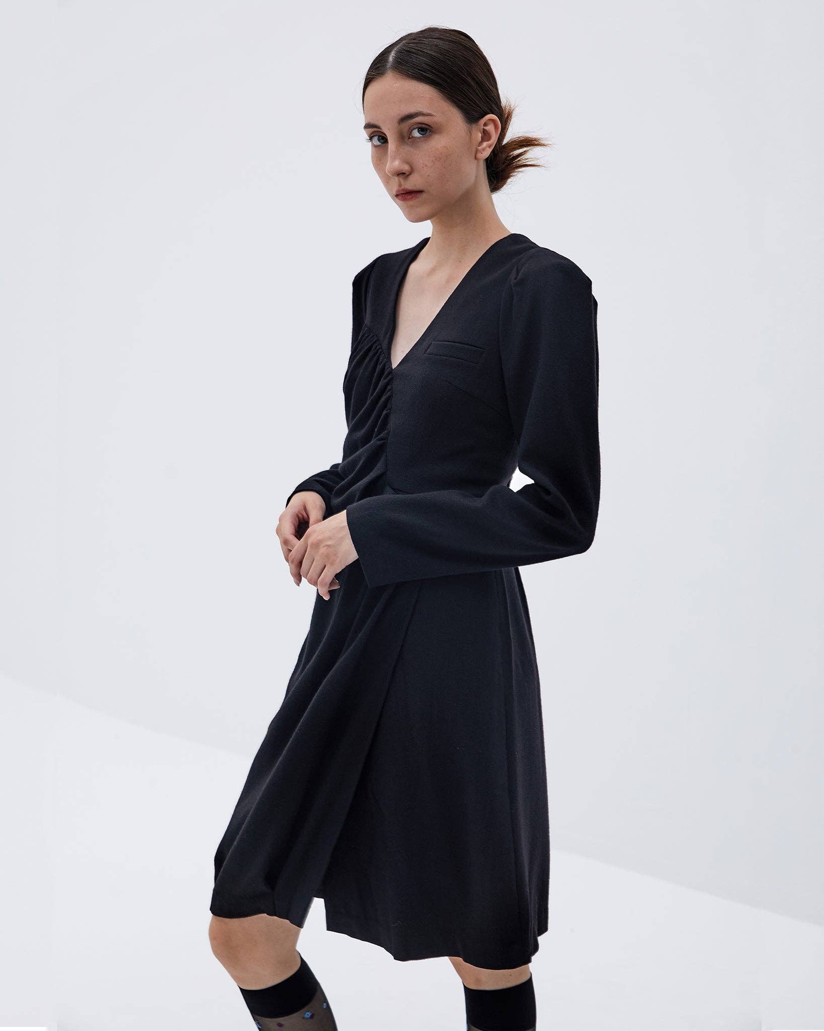 The Oria jacket is a mid-length jacket made of wool and mohair, with a vintage spirit. It features a straight cut with marked shoulders and fastens with decorative silver buttons that highlight the gray shades of the jacket. Its preppy and romantic spirit lies in its small shoulders and open collar. It has patch pockets on the sides. SIZE ADVICE Sasha is 1.73m tall and wears a size 36. We recommend choosing your usual size or one size up as the jacket can be worn oversized. FABRIC MAIN FABRIC: 22% mohair, 45% wool, 6% silk, 26% polyester, 1% polyamide LINING 1: 11% cotton, 12% modal, 77% polyamide LINING 2: 100% polyester CLEANING NOT WASHABLE, DRY CLEAN ONLY, HANG TO DRY, NO BLEACH, NO TUMBLE DRY, IRON AT MAX 110°C.