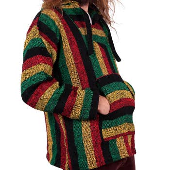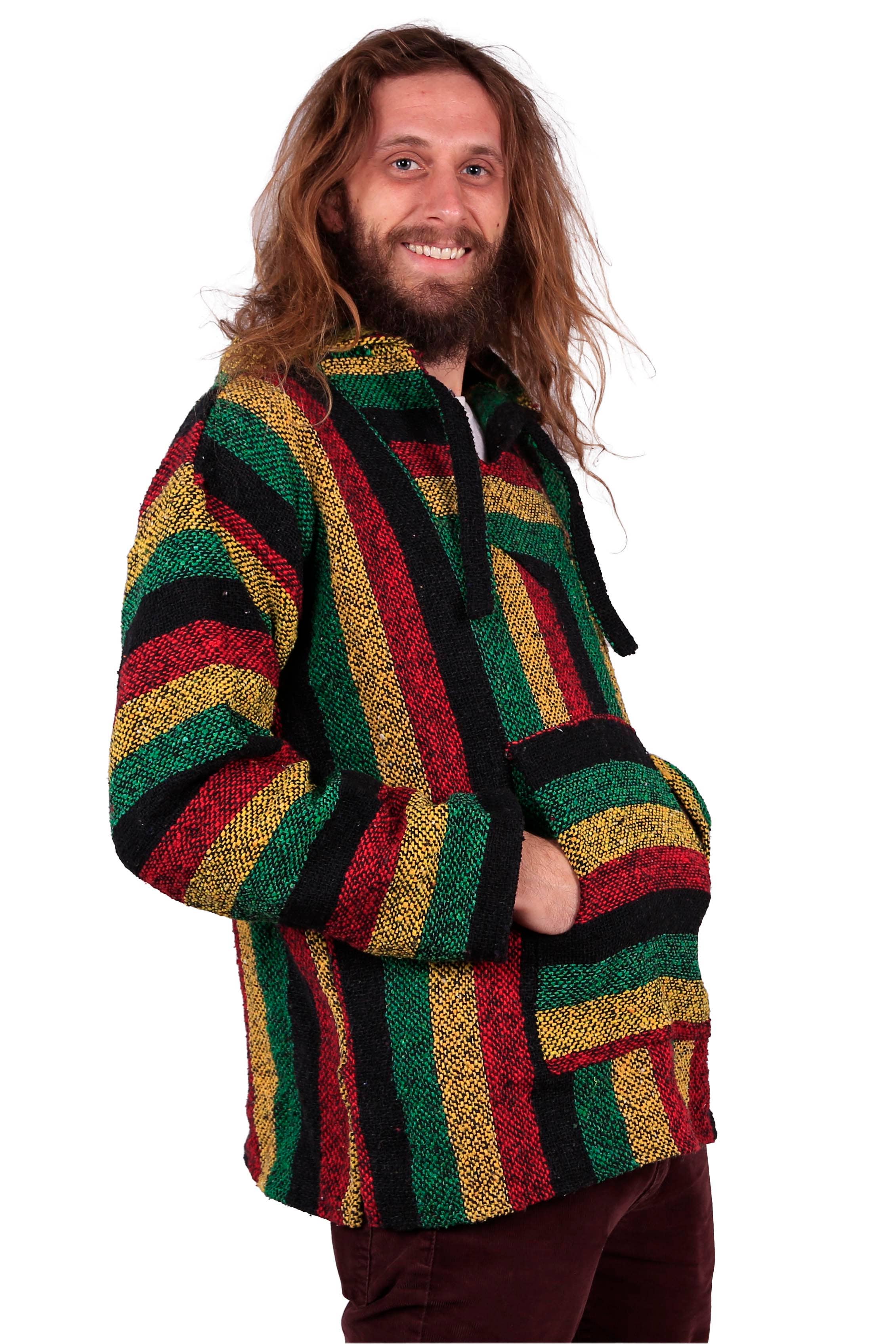 Rasta color baja. Made in mexico from a blend of cotton, acrylic & polyester. An iconic dead concert parking lot staple that just never gets old or in the way. The versatile baja takes the edge off the crisp bite of autumn, the chill of late winter, the cool spring evenings and even the surprising shivers that occur on those summer festival nights in the mountains or those midnight strolls on the windy beaches. The baja is a hippie's best friend all year long! Stay warm with peace, love, & happiness!!! Approximate dimensions: (large) chest:50", length:28", sleeve:24". (extra large) chest:53", length:29", sleeve:25". (extra-extra large) chest:56", length:30", sleeve:26" Always comes in rasta colors. Patterns: assorted striped patterns. You're getting a "wearable work of art" & variety is an intended part of each item's beauty. Most gypsy rose products are hand made by humans, not by robots mass produced in some huge factory.