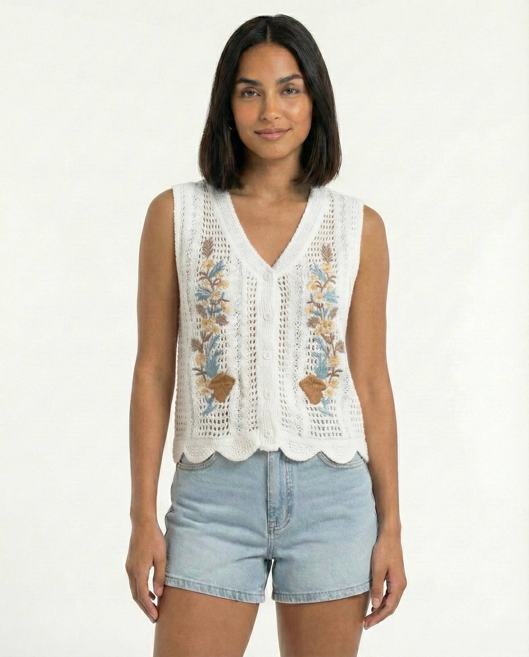 This striking two-piece set features a sleeveless top and matching high-waisted shorts, beautifully detailed with bold contrast daisy motifs. Meticulously crafted from 100% premium cotton, the set balances a delicate cream-colored open-stitch pattern with deep black floral accents. The top is designed with a classic round neckline and a flattering scalloped hem, while the shorts feature a coordinated floral border for a cohesive, artisanal look. Material: 100% High-Quality Cotton for a soft, natural, and breathable feel. Intricate geometric crochet knit with high-contrast floral borders and scalloped edges.One sleeveless crochet top and one pair of matching high-waisted shorts. A perfect ensemble for vacation styling, beachside outings, or summer festival wear.