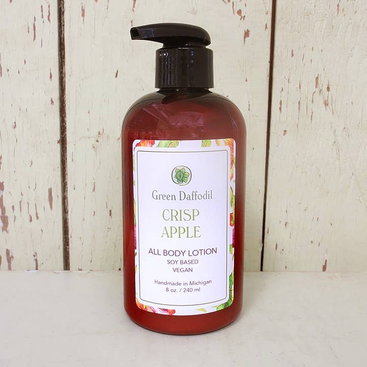 With our hand poured Crisp Apple soy lotion, think cider mills, farmers market, and apple orchards and you'll love this yummy lotion. It has a true, right-from-the-tree apple scent that is all fruit. It is lightweight, non-greasy, super moisturizing, absorbs quickly, and vegan. We scent our lotions with the same body safe oils that we use with all our of products. This mini size is perfect for your purse, travel, favors and more. We have 4 oz tester bottles to help with sales! Product Highlights: Size: 2 oz Amber BFA Free Plastic bottle with black flip top. Handmade in Michigan Ingredients:Purified water,extra cold-pressed soy lipids,soy amino acids, stearic acid, cetyl palmitate, cetearyl-alcohol-ceteareth-20, glycerin, extracts of kone nut, lemon grass, horse chestnut and witch hazel, isopropyl myristate, carbomer, triethanolamine, propylene glycol, diazolidinyl urea, phthalate-free fragrance oils. Suggested Tags - Orchard, Fruity, All Body Lotion, Fall Harvest, purse size