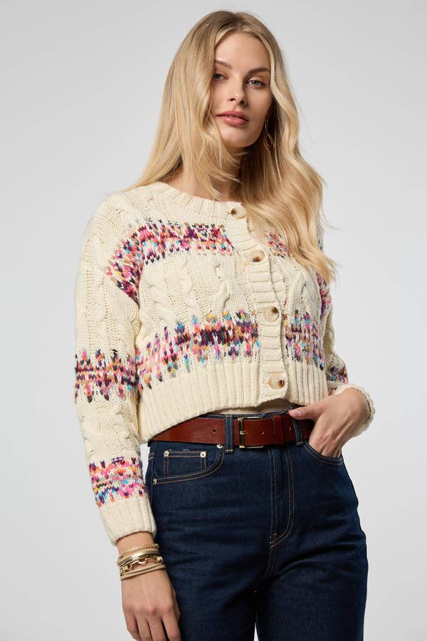 "Discover our Knit Cardigan With Bauble Sleeves. This short, flattering sweater features whimsical balloon sleeves with textured bauble detailing for a playful yet polished look. The ribbed cuffs and slightly oversized fit create a flattering silhouette, making this chunky cardigan easy to style from jeans to skirts or relaxed home wear. Finished in a cozy chunky knit, it’s a versatile layering piece for everyday comfort. Material: Acrylic Length: 23"" Width: 21"" Knitted"