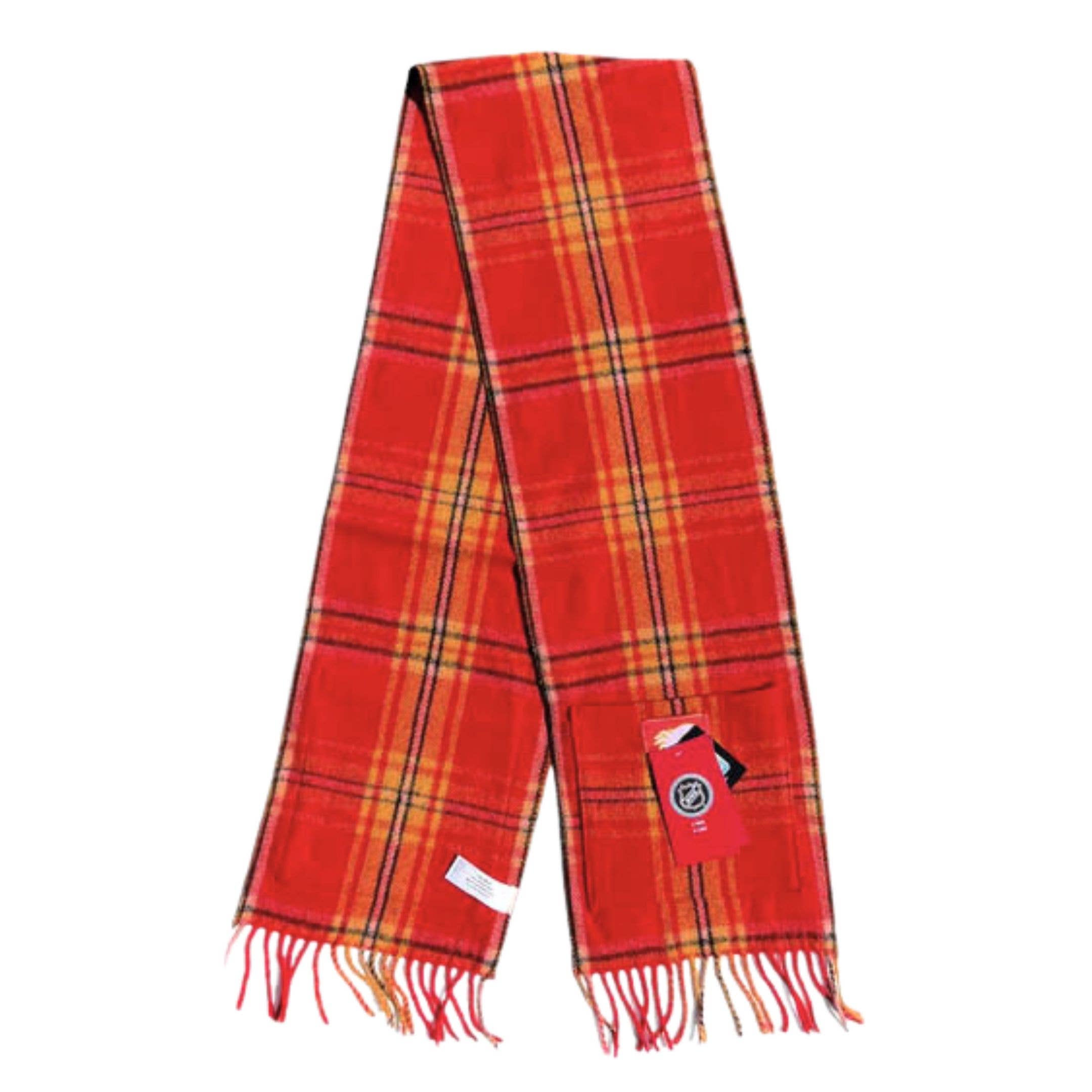 Fine merino pocket scarf 23cm wide x 158cm long, surged with two pockets. Dimension: 172cmx23cm. The Rockies a system of multiple ranges of mountains that runs from the Canadian Prairies to the Pacific Coast. The light and dark Browns represents the layered sedimentary rock such as limestone and shale. Green represents the Five national parks that are located within the Canadian Rockies. Red is for the Canadian Maple Leaf which symbolizes tolerance, unity, and strength.