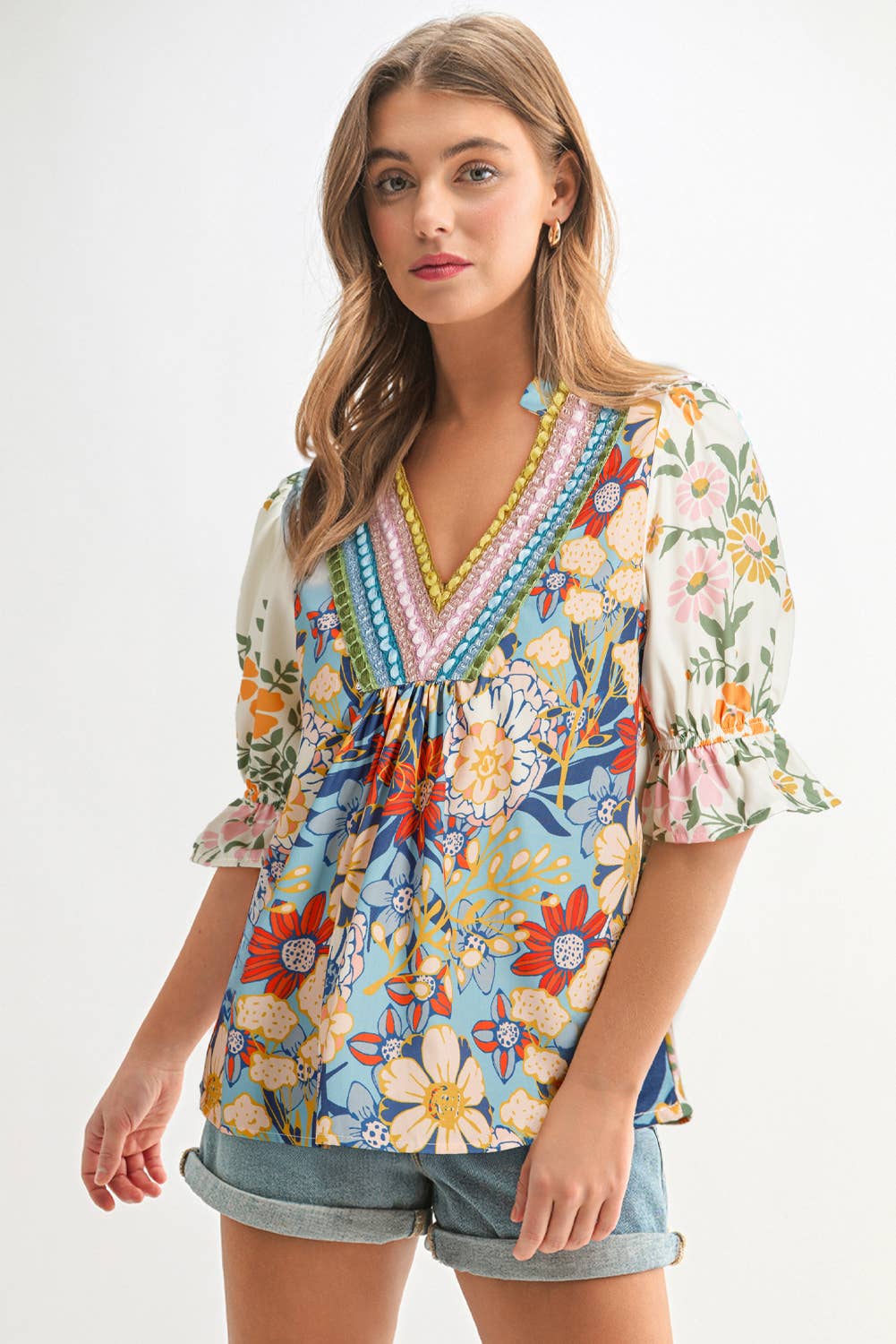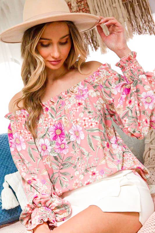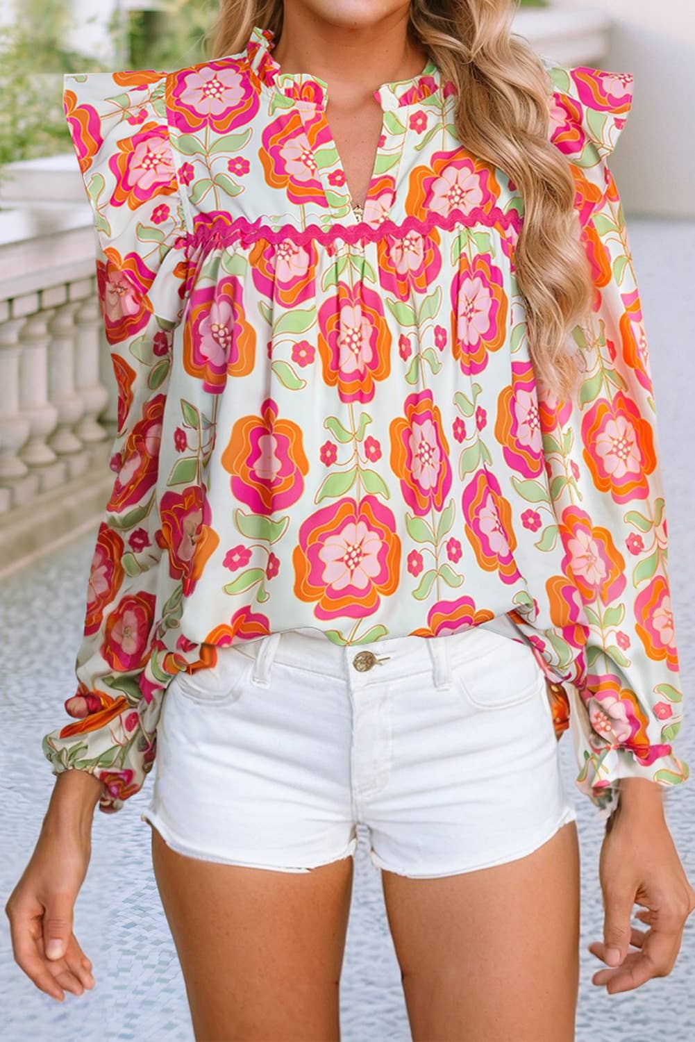 This floral blouse provides a fresh and stylish look. Delicate ruffles for a feminine and romantic touch. Trendy bubble sleeves add a chic and modern flair. Flattering V-neckline enhances the neckline. Wholesale blouses strike the perfect balance between chic and casual.