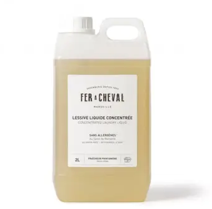 Fer à Cheval's Concentrated Liquid Detergent is formulated with Marseille soap known for its legendary stain removal effectiveness and its gentleness for the whole family. A concentrated detergent for 40 machines. Effective at low temperatures on the most stubborn stains, it respects colours and provides spring freshness to laundry. Composition of 99% ingredients of natural origin.