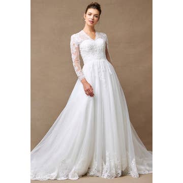 Crafted with meticulous attention to detail, this exquisite V-neck backless tulle wedding dress features long sleeves adorned with delicate applique decoration, adding a touch of vintage charm. The graceful silhouette flatters every curve, while the flowing tulle fabric creates a dreamy, ethereal effect. Perfect for the bride seeking a timeless and sophisticated look on her special day. Fit: Please refer to Size Chart. Length: Floor Length. Sleeve Style: Long Sleeves. Closure: Concealed Zipper Up The Back. Undergarments: Padded Enough, with Lining.