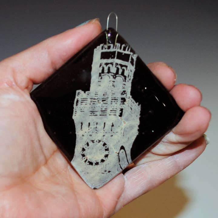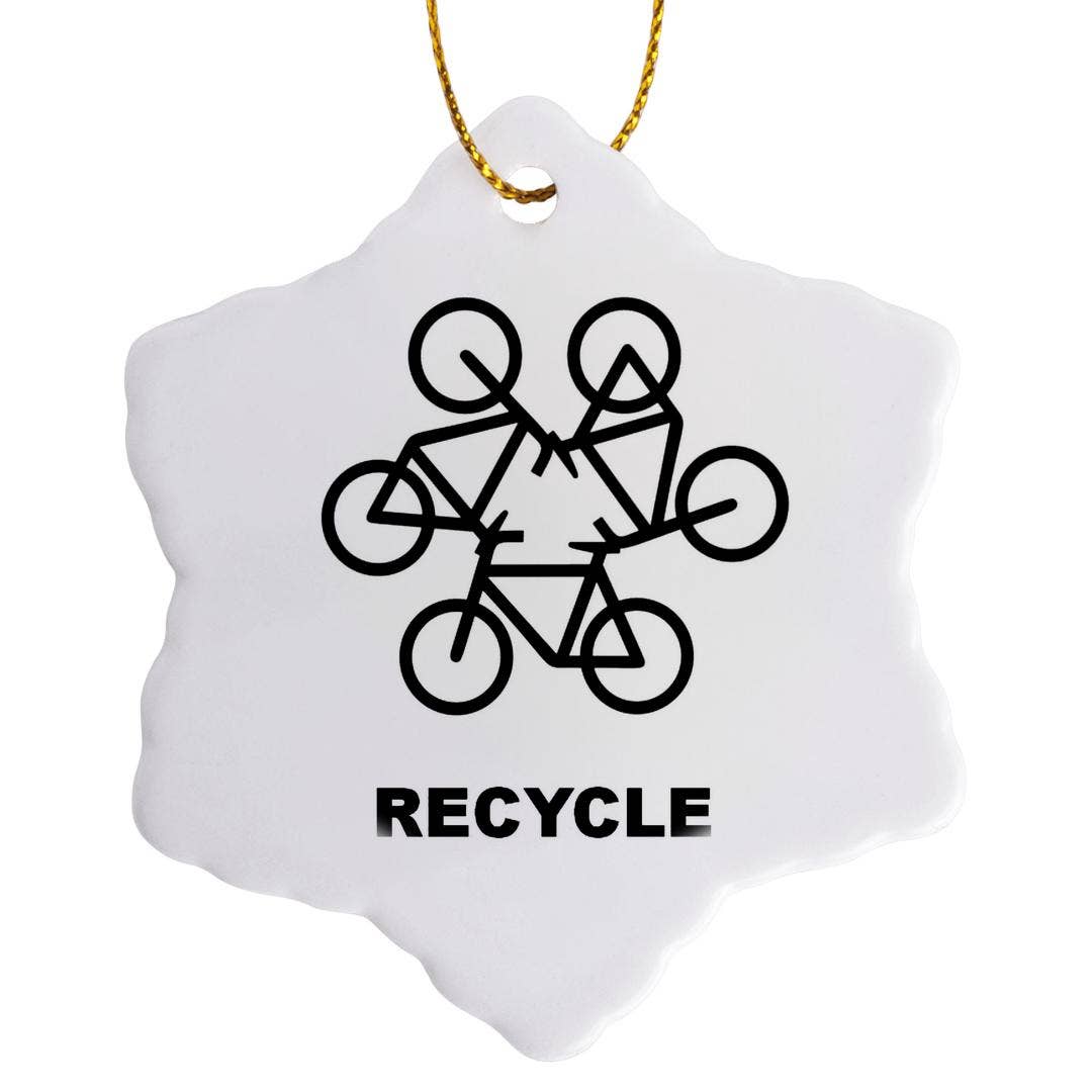 Fun and bright Christmas ornaments, not to heavy for your branches and cute as buttons.This ornament features our vintage Bike design, and doubles as a sun-catcher. A great size (and pricepoint) for office gift exchanges, stocking stuffers, teacher's gifts, and impulse buys. * Red glass, printed in green enamel * 2.25" square * Hung from luxe velvet ribbon * Handmade in the USA Ornaments are screen printed, fused glass. Glass is cut, and screen printed by hand with fine glass enamels, outfitted with an embedded hook, then fused overnight to 1415 degrees in a kiln. Each piece is made by artist Laurie Freivogel in her Oak Park studio.