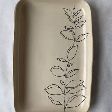 Bay Laurel... for Wisdom, Courage & Strength A crown for a hero… prized by the ancients as a reward for the highest achievements, also a sign representing wisdom both acquired and intuitive. This handmade stoneware piece is designed to be used for kitchen and table and is best hand washed. Handmade, hand etched with black inlay. Measures 6.5” x 9.5"