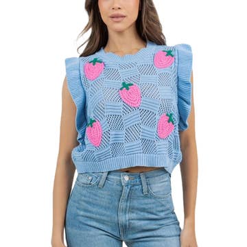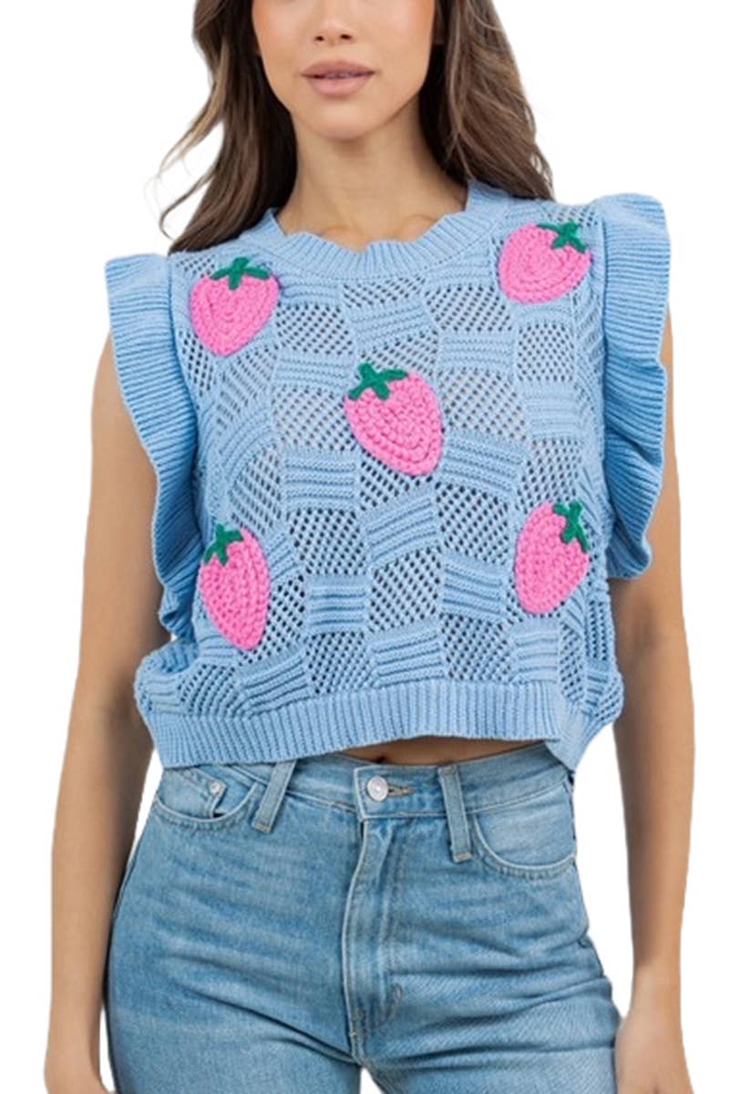 * Style No: PL9799 - Medium-weight soft knitting sweater - Colorful strawberry jacquard colorblock design - Rib bands on bottom, neckline and sleeves - Model is 5' 8" 32-23-34 and wearing a Small