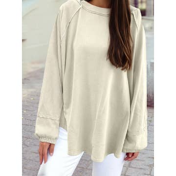 LONG SLEEVE ROUND NECK CUT HEM SWEATSHIRT 60% COTTON, 40% POLYESTER Size S(2) - M(2) - L(2) -XL(2) Made in China * MODEL IS 5'7" AND IS WEARING A SIZE SMALL KNIT HODDED, SWEATSHIRT, SWEATPANTS, KNIT TOP, LOOSE TEE, WOMEN BLAZER, PLAID SHACKET, OVERSIZED SWEATER, V NECK SWEATER, FLANNEL JACKET, PLAID SHACKET, CABLE KNIT SWEATER, CROCHET CARDIGAN, WESTERN, BOHEMIAN, PLUS SIZE CLOTHING
