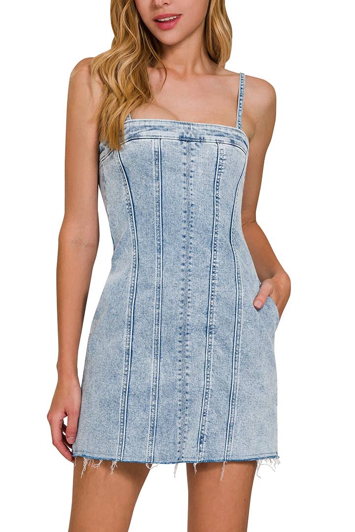 Turn heads in this edgy yet playful strapless mini dress, crafted from high-quality light-wash denim. Featuring a corset-inspired bodice with vertical seam detailing, this dress hugs your figure for a flattering silhouette. The standout feature is a wide belted waist with grommet accents and a statement buckle that cinches the waist perfectly. The pleated mini skirt adds a flirty flair, making it ideal for both day and night looks. Pair it with sneakers for a casual vibe or heels for a night out