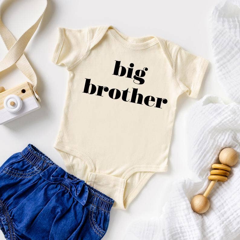 "Big Brother". Announce big brother's status in style! This super-soft, 100% organic cotton outfit features modern typography in crisp black ink on a luxe cream colored bodysuit - designed with love and screen printed in-house. Short and long sleeve options. Features: • 100% Organic Cotton • Nickel-free bottom snaps • Water-based dyes • Environmentally-friendly and naturally hypoallergenic • Sustainably sourced and ethically produced • GOTS Certified • Printed by hand in our Ohio studio