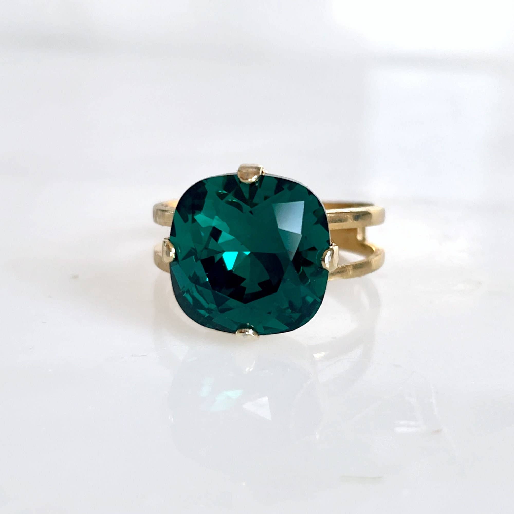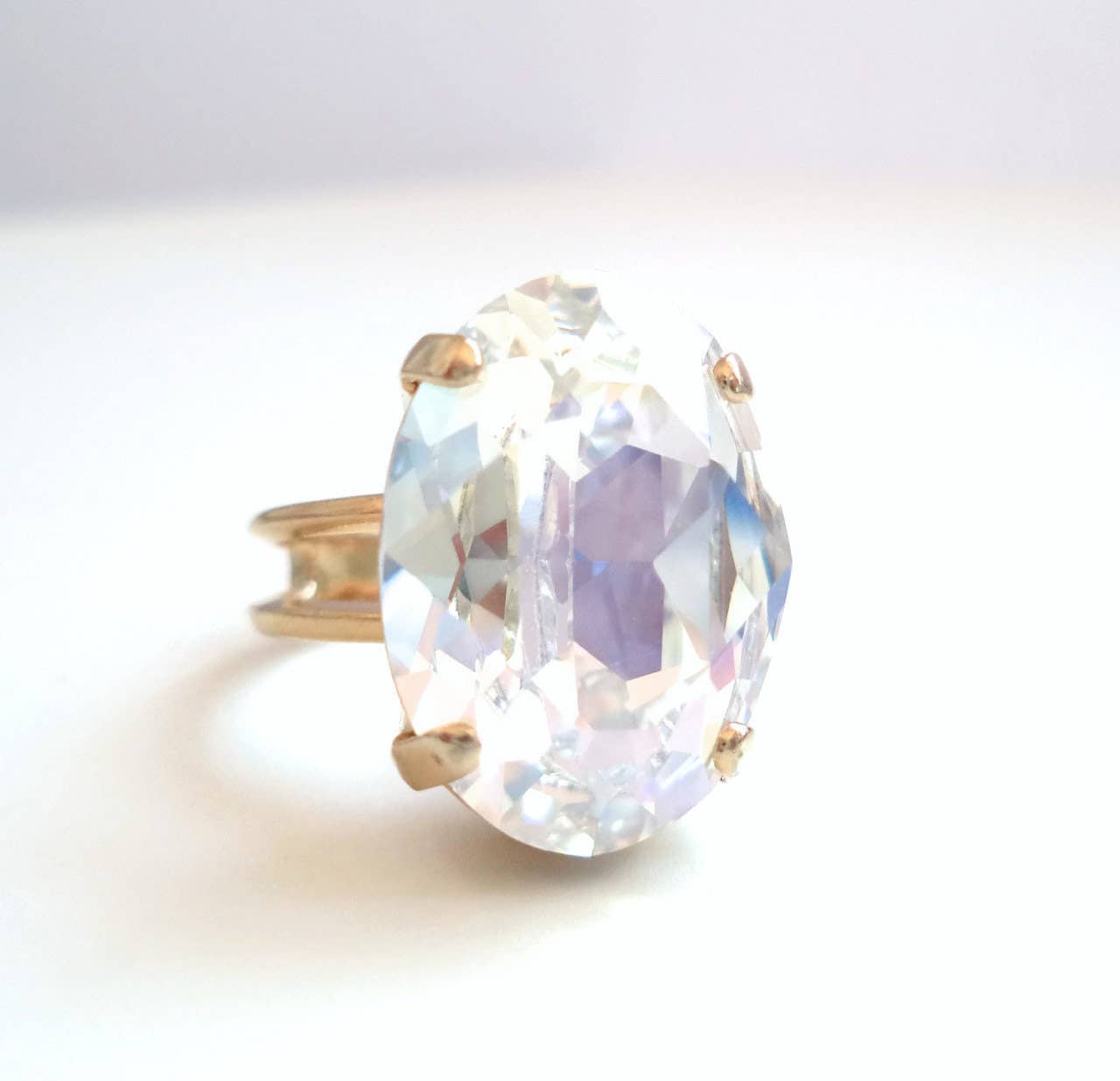 This elegant cocktail ring makes quite a statement. I have hand-set a large 18mm oval Swarovski crystal into a gold plated adjustable ring (about size 5 at the smallest and can be worn larger from there). The more than 12-carat gem is perfect for a special occasion or everyday bling. The shade is a light green called chrysolite. Ring base is Nickel Free Available in a variety colors and contact me for more info. Ring was modeled by Adriana Michelle, Miss Los Angeles California Latina 2013 and Publisher/Editor-in-Chief of AMBmagazine Copyright © 2013, all rights reserved LoveYourBling is an authorized SWAROVSKI® ELEMENTS Branding Partner.