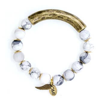 Howlite is a lovely stone typically known to soothe stress and anxiety, relieve pain, and encourage emotional expression. Often related to a higher spiritual consciousness. Looks amazing with multiples stacked together. Each one is slightly different from the next, with variations on designs and placement of metal accents. Every bracelet is adorned with an "Often Wander" charm. Handmade in California All bracelets are made 7”. Want a larger size? Just send us a message.