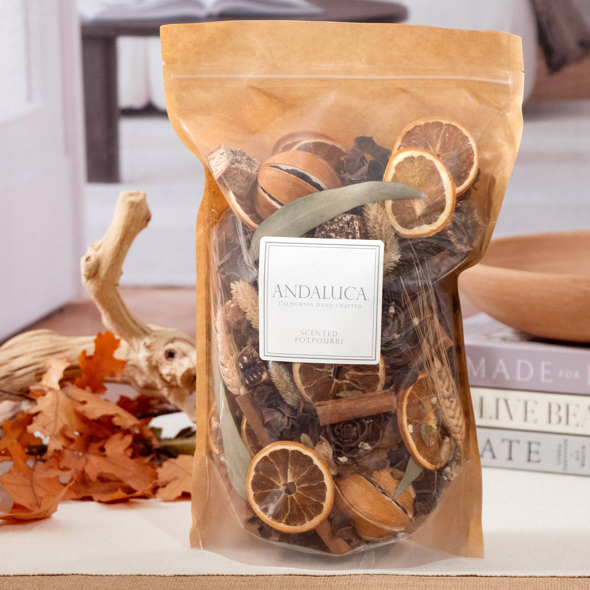 Simple harvest botanical styling and fragrance make this potpourri a favorite of ours for the fall season. You will love the fresh harvest atmosphere this potpourri and aroma bring into your home. Always handcrafted in California. Bag is 7" wide x 3" deep x 13" tall 20 ounce bag, comes pre-scented. Fragrance notes: Top: clove leaves, orange zest, spun sugar. Middle: grated ginger, nutmeg, decadent pumpkin accord. Base: spiced musk, vetiver, creamy sandalwood.