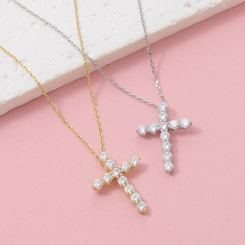 A brilliant outward expression of inward faith! Created in Sterling Silver, this traditionally designed cross is outlined with 1ct TW shimmering diamonds. Cut, Color, Clarity, and Carat Weight * Cut: Very Good * Color: I-J * Clarity: I2-I3 Stone Characteristics * Type: Diamond * Treatment: Genuine * Diamond Source: Natural Mined Diamonds * Total number of stones: 11 * Stone shape: Round * Stone enhanced: No Metal Characteristics * Metal: Sterling Silver * Solid Metal: Yes * Plating: Rhodium * Finish: High Polish * Nickel-free: Yes * Chain Length-18'' * lock type: Lobster clasp Measurement