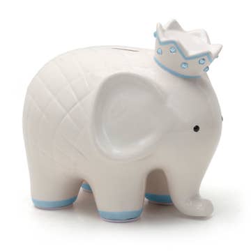 This charming ceramic piggy bank features a playful elephant design adorned with a delicate blue crown embellished with subtle blue gems. Perfect for children and families, it serves as an engaging keepsake to teach saving habits while also adding a whimsical touch to any room. Quality Materials Crafted from high-quality dolomite ceramic, this elephant bank is durable and built to last. It features a smooth glazed finish that enhances its sleek silhouette and preserves the hand painted details, ensuring long-lasting vibrancy. Design Features The elephant showcases textured diamond-patterned details on its back and soft blue accents around its feet and crown. Its small size and rounded edges make it safe and suitable for kids. The coin slot on top provides easy access for saving money, while the crown adds a unique, regal flair. Use and Benefits * Encourages financial responsibility in children * Creates lasting family memories and cherished keepsakes * Hand painted details make each bank unique * Ideal gift for baby showers, birthdays, or family celebrations