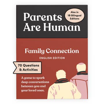 Parents Are Human is a bilingual card game that helps you spark deep conversations with your parents & loved ones. 💡 70 increasingly deep prompts (50 question cards & 20 action cards). 🌶️ Two levels of difficulty to inspire connection, compassion, and vulnerability. 💬 Available in English (only) or 18 additional bilingual editions. Each bilingual edition features English on the front of each card and their translations on the back to help bridge language, cultural, and generational gaps.