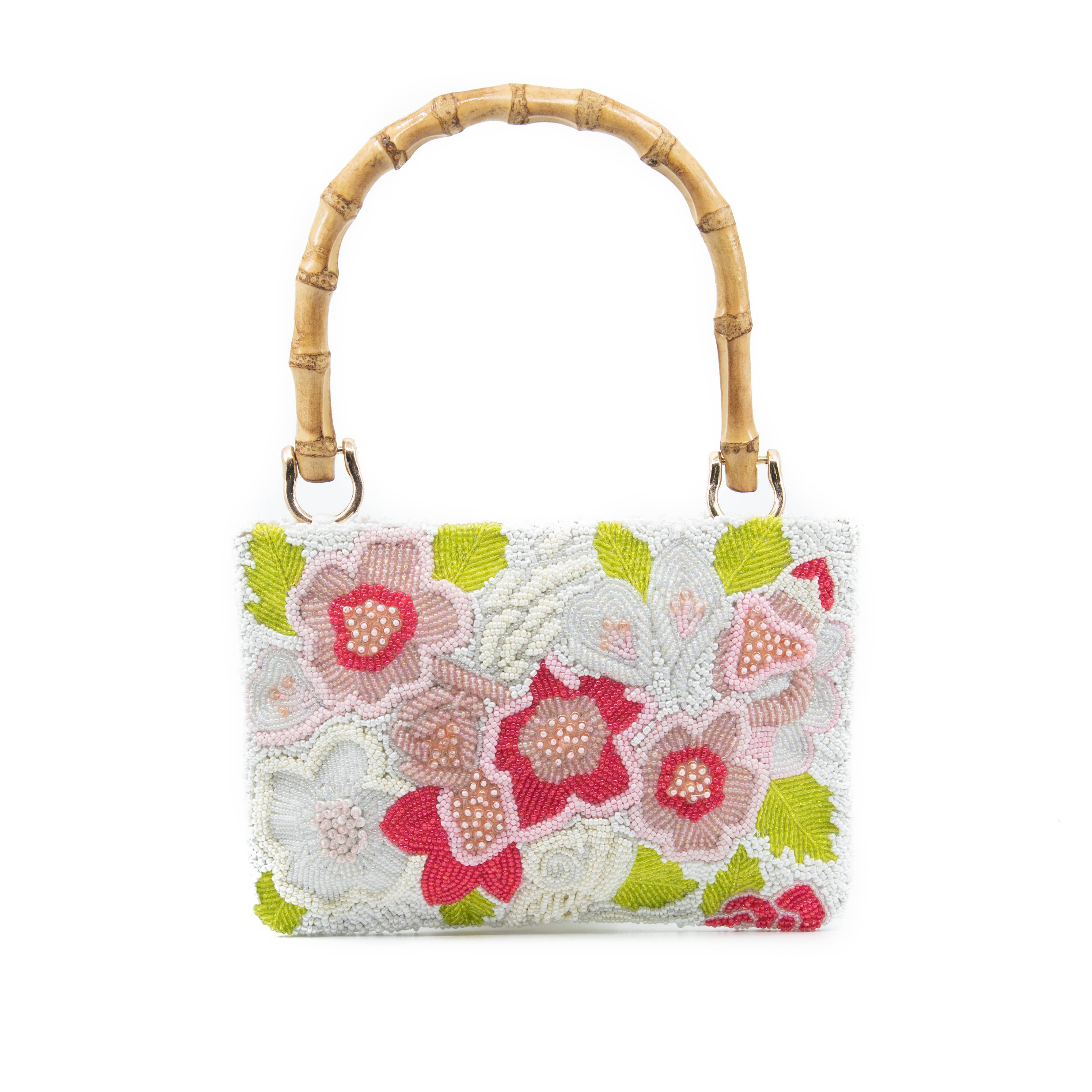 Fully Beaded Bag . This product is 100% handmade and hand-beaded. Luxurious satin lining, made with a small interior pocket for cards and other valuables. Bamboo handle.