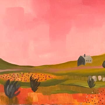 Quilted landscape is an 8x10in Art Print of and original hand painted illustration printed on cardstock. Details • Dimensions: 8 x10 inches • Handmade • Packaged with cardboard backing to keep from bending and protective sleeve Due to monitor differences, actual colors may vary slightly from what appears online.