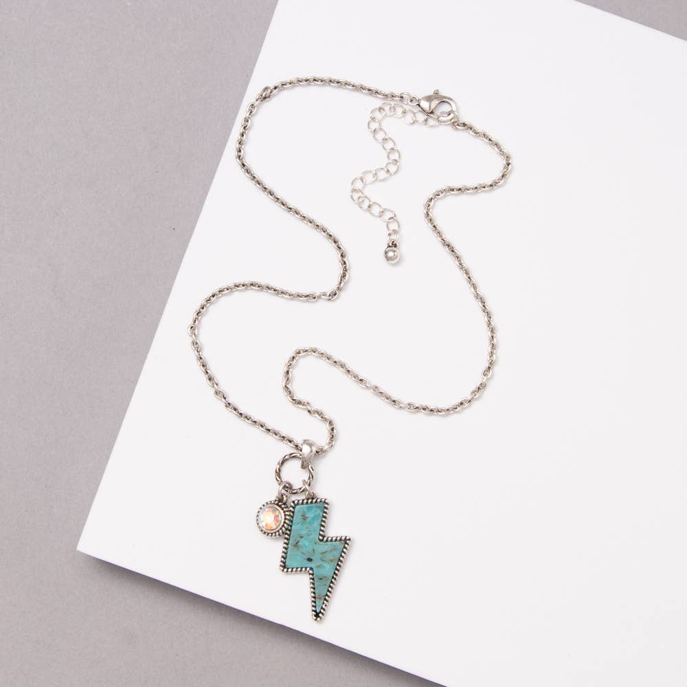 Bolt Necklace | Stone Lighting Bolt Dainty Chain Necklace | White Turquoise Black Red Pink Yellow | Accessories | Jewelry Stone Lighting Bolt Dainty Chain Necklace - 15" length; 3" extender - 1.125" pendant drop - Silver tone hardware - Lobster clasp closure MATCHING EARRINGS CAN BE FOUND HERE!!!! https://www.etsy.com/listing/997739472/western-lighting-bolt-stone-bead-earring MATCHING RINGS CAN BE FOUND HERE!!!! https://www.etsy.com/listing/997830640/western-lightning-bolt-adjustable-ring ** might tarnish if it gets wet in shower/ swimming